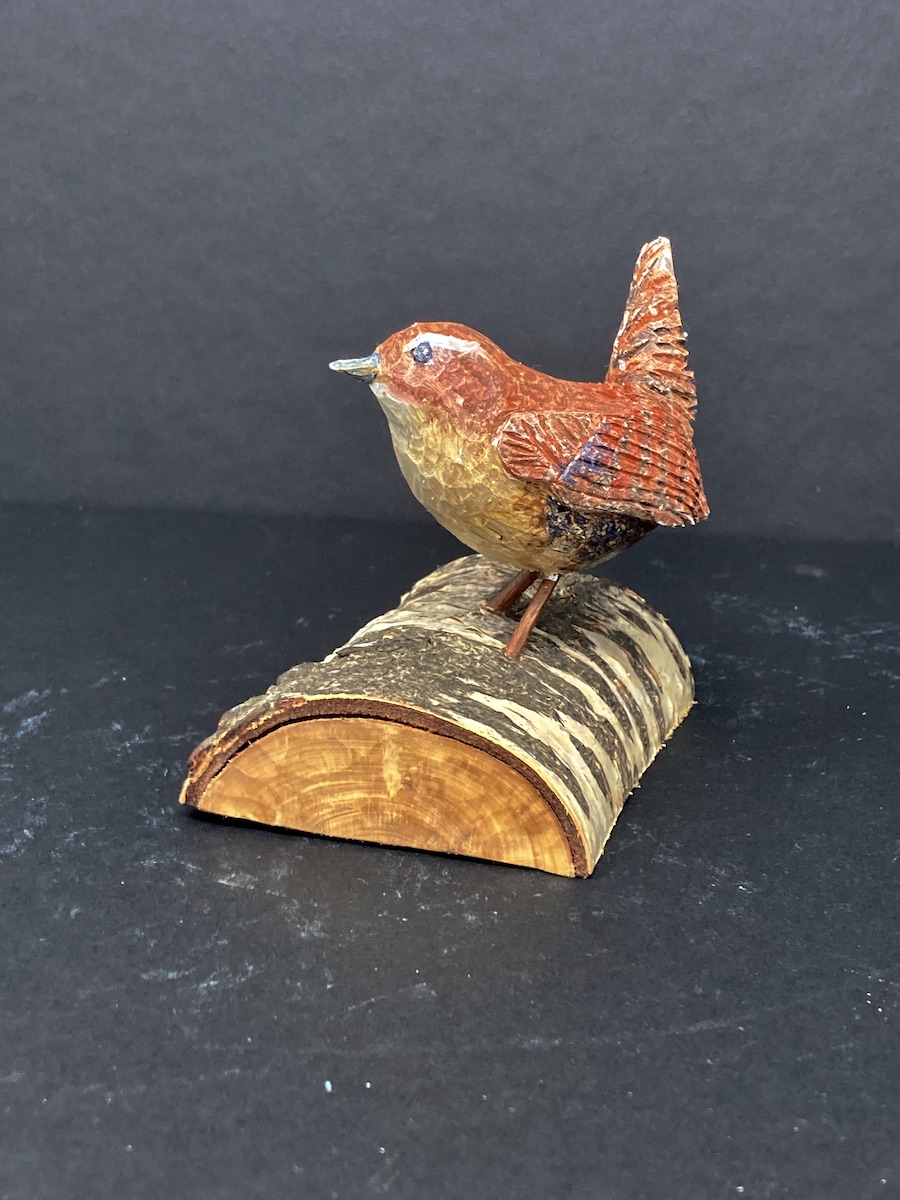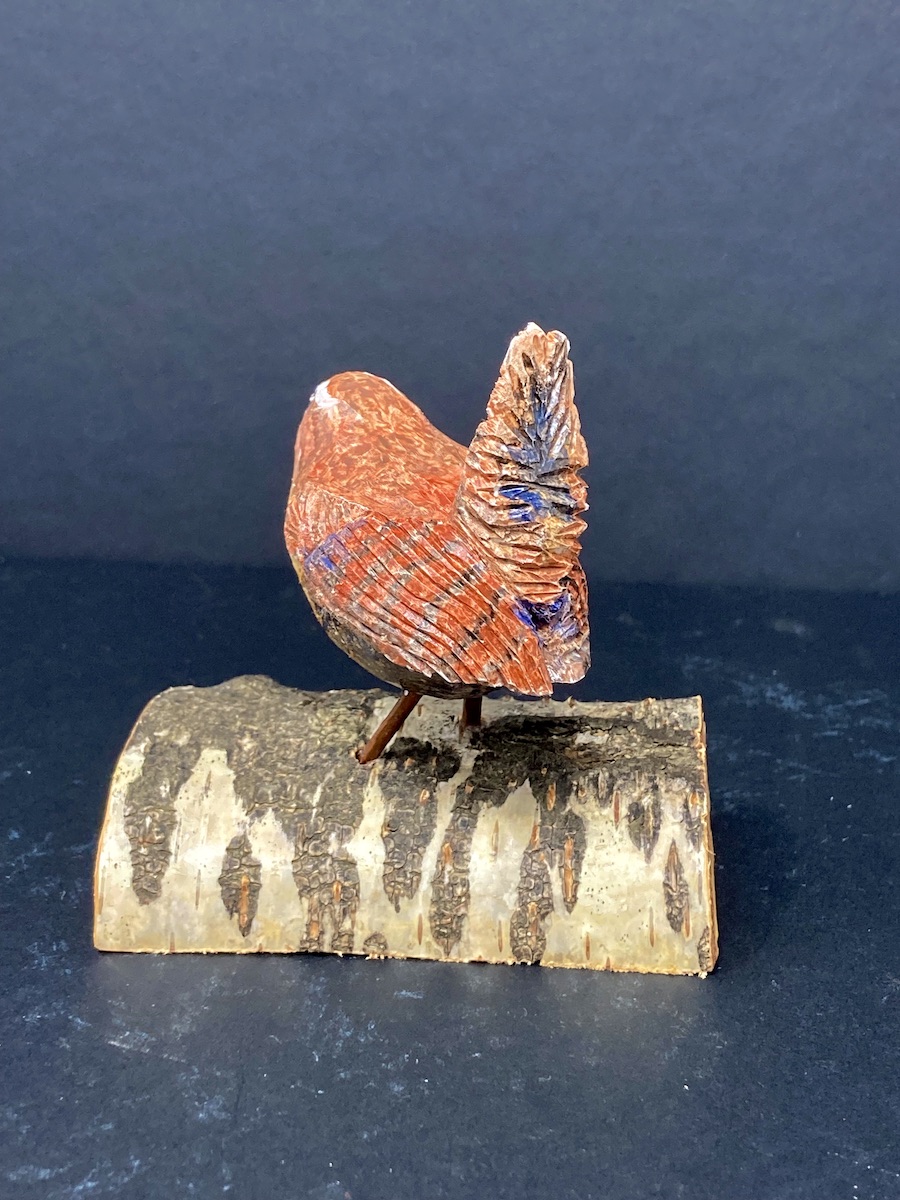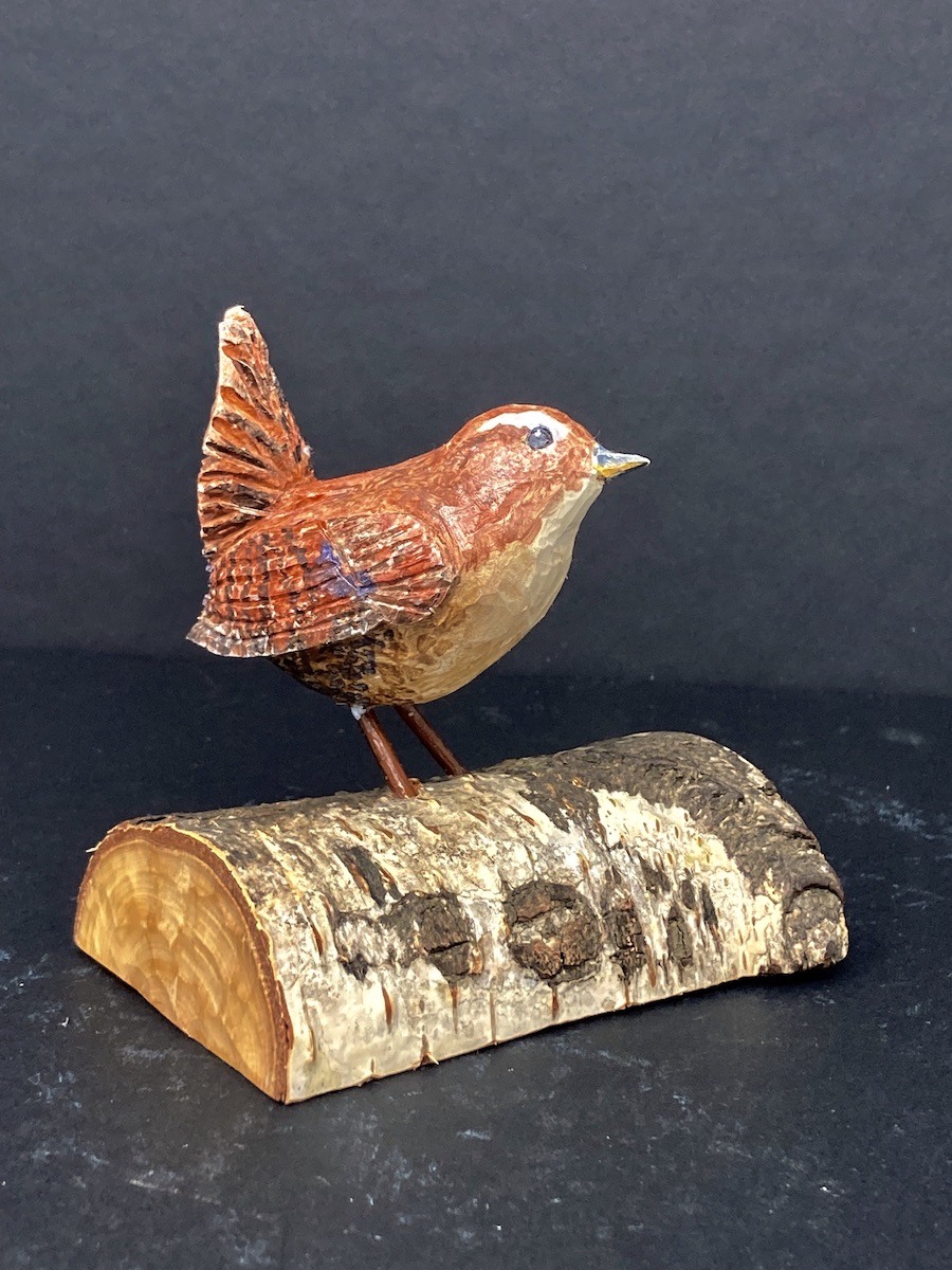 Zaunkönig handgeschnitzt auf Birkenhalbstamm